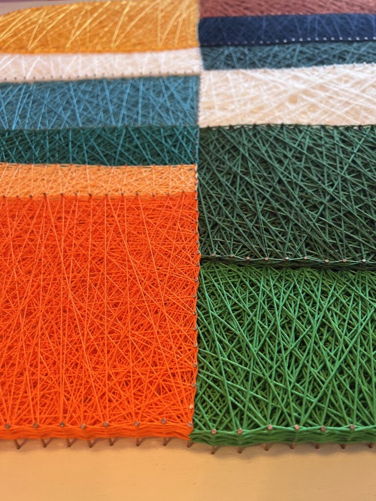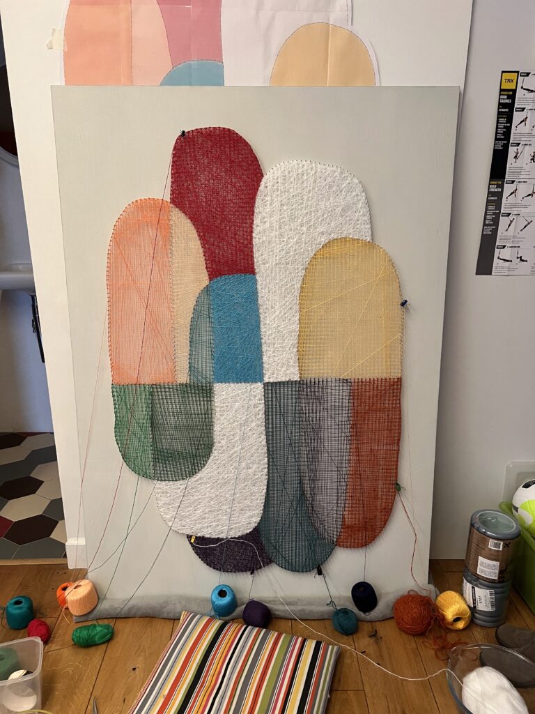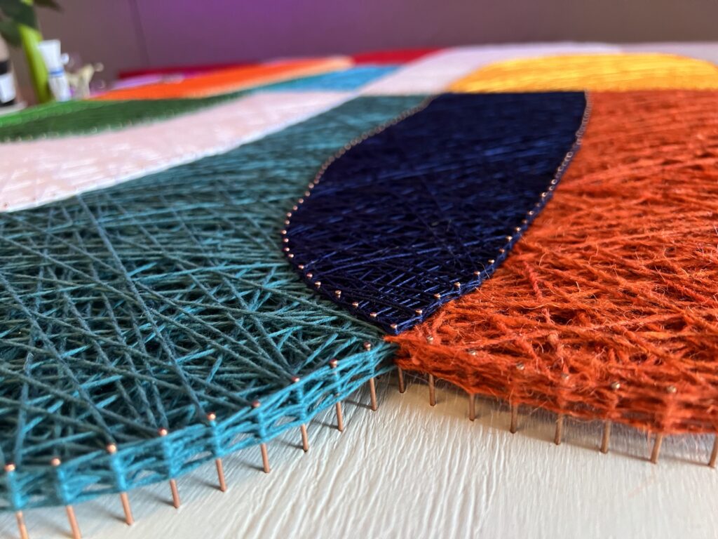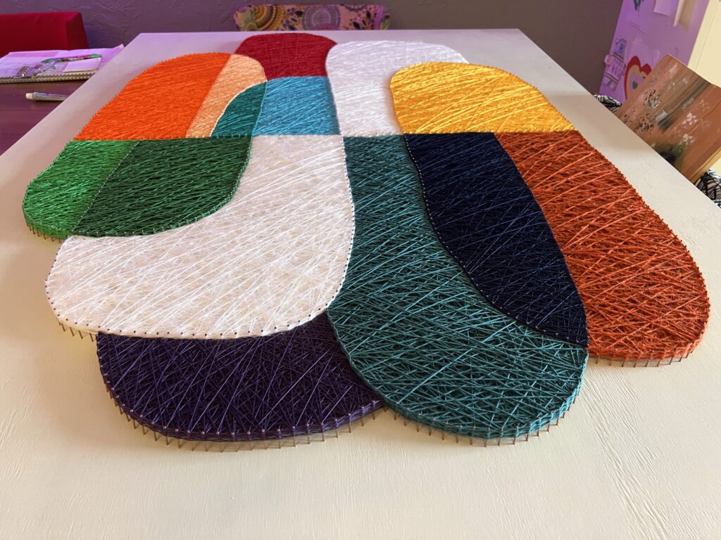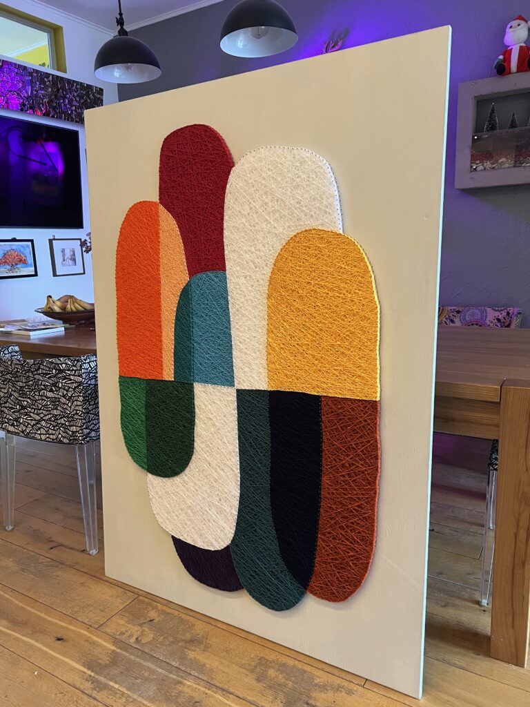 Передо мной стояла задача создать декоративное панно, которое будет одновременно стильным, лаконичным и тёплым — в прямом и переносном смысле. Мы с заказчиком остановились на абстрактной композиции из мягких округлых форм, насыщенных цветов и чёткой геометрии. Всё это было реализовано в моей любимой технике стринг-арт, где нити буквально «рисуют» рельеф и светотень.