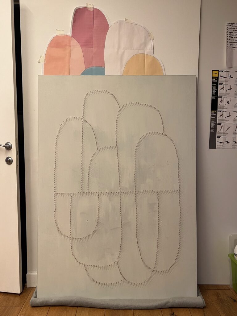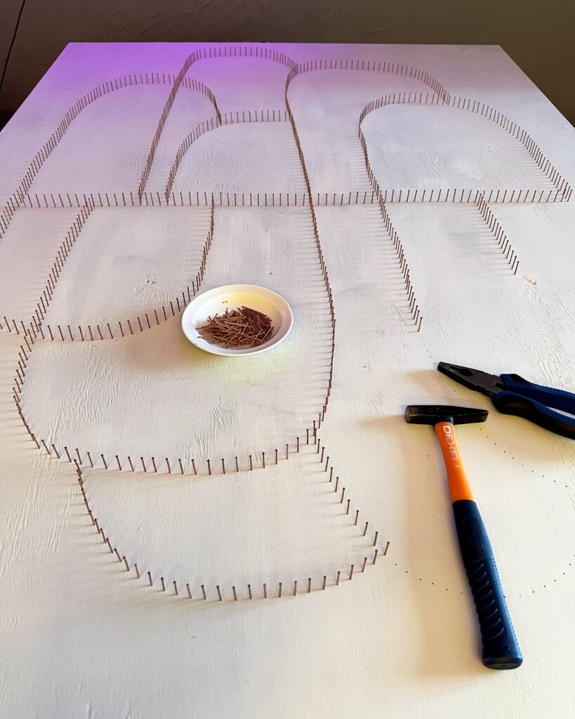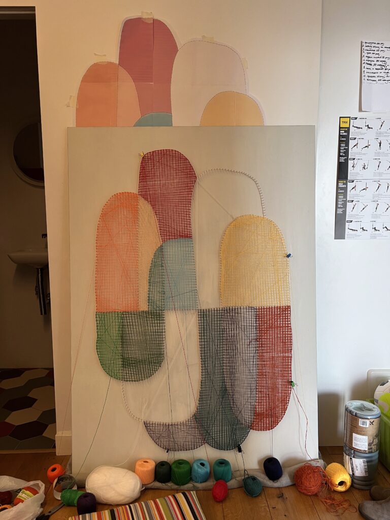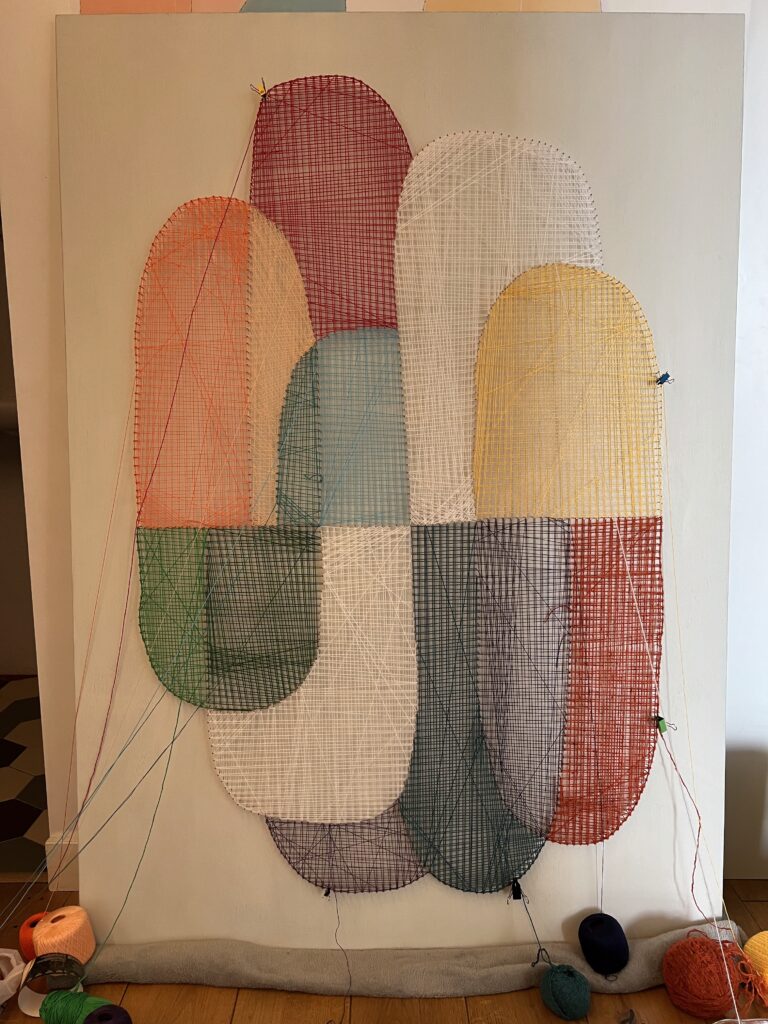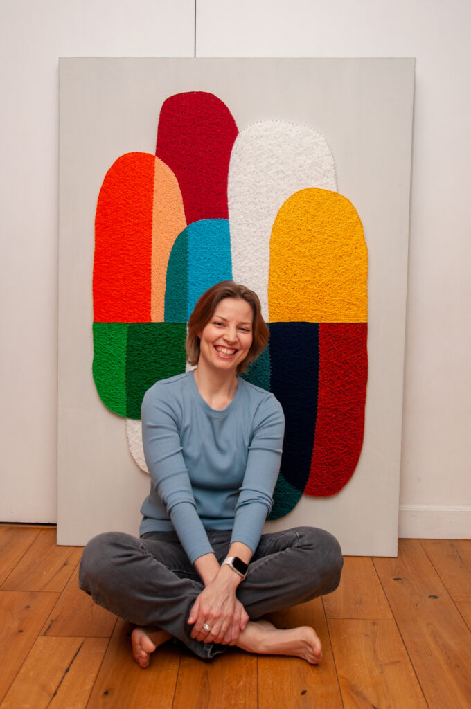 Передо мной стояла задача создать декоративное панно, которое будет одновременно стильным, лаконичным и тёплым — в прямом и переносном смысле. Мы с заказчиком остановились на абстрактной композиции из мягких округлых форм, насыщенных цветов и чёткой геометрии. Всё это было реализовано в моей любимой технике стринг-арт, где нити буквально «рисуют» рельеф и светотень.
